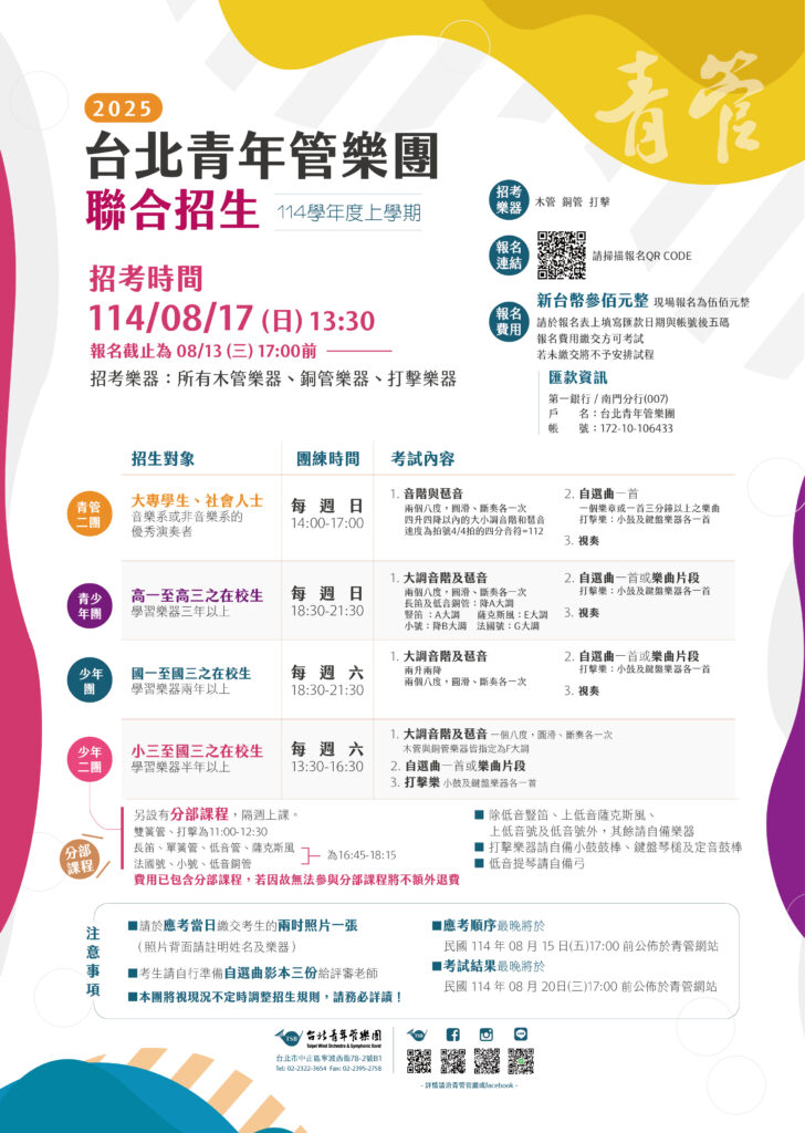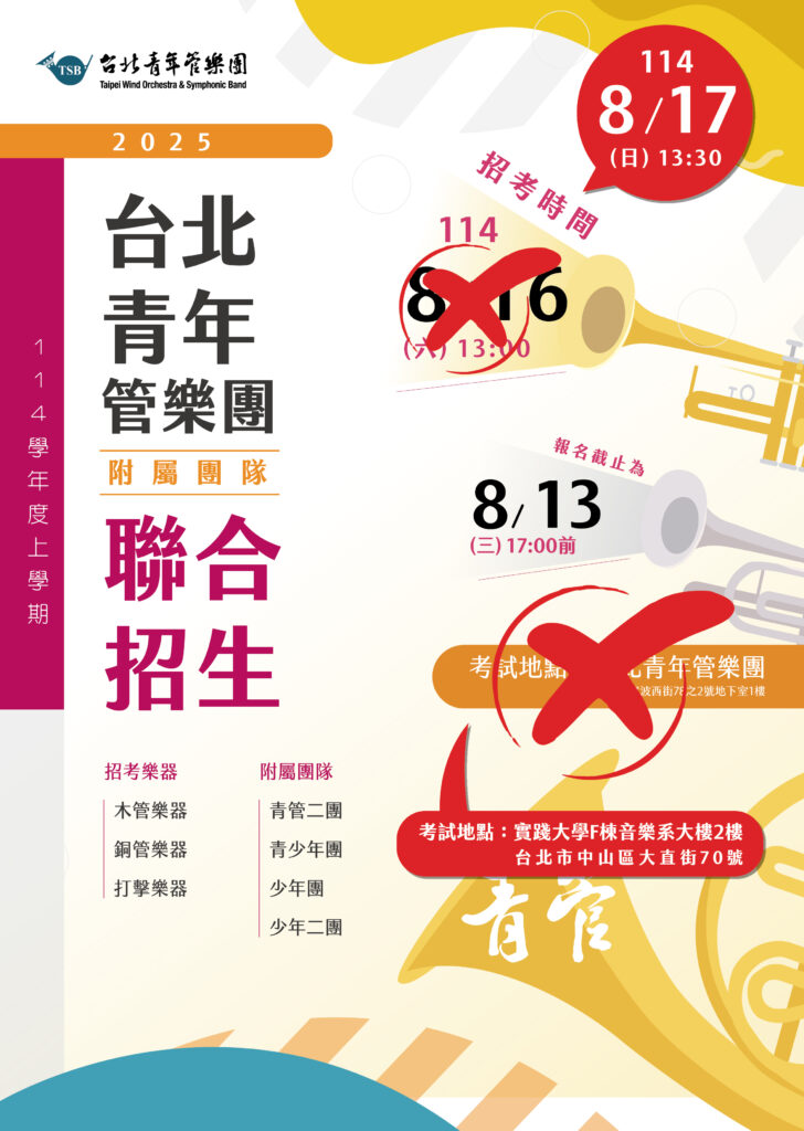 【公告】台北青年管樂團114學年度上學期附屬團隊招生資訊
